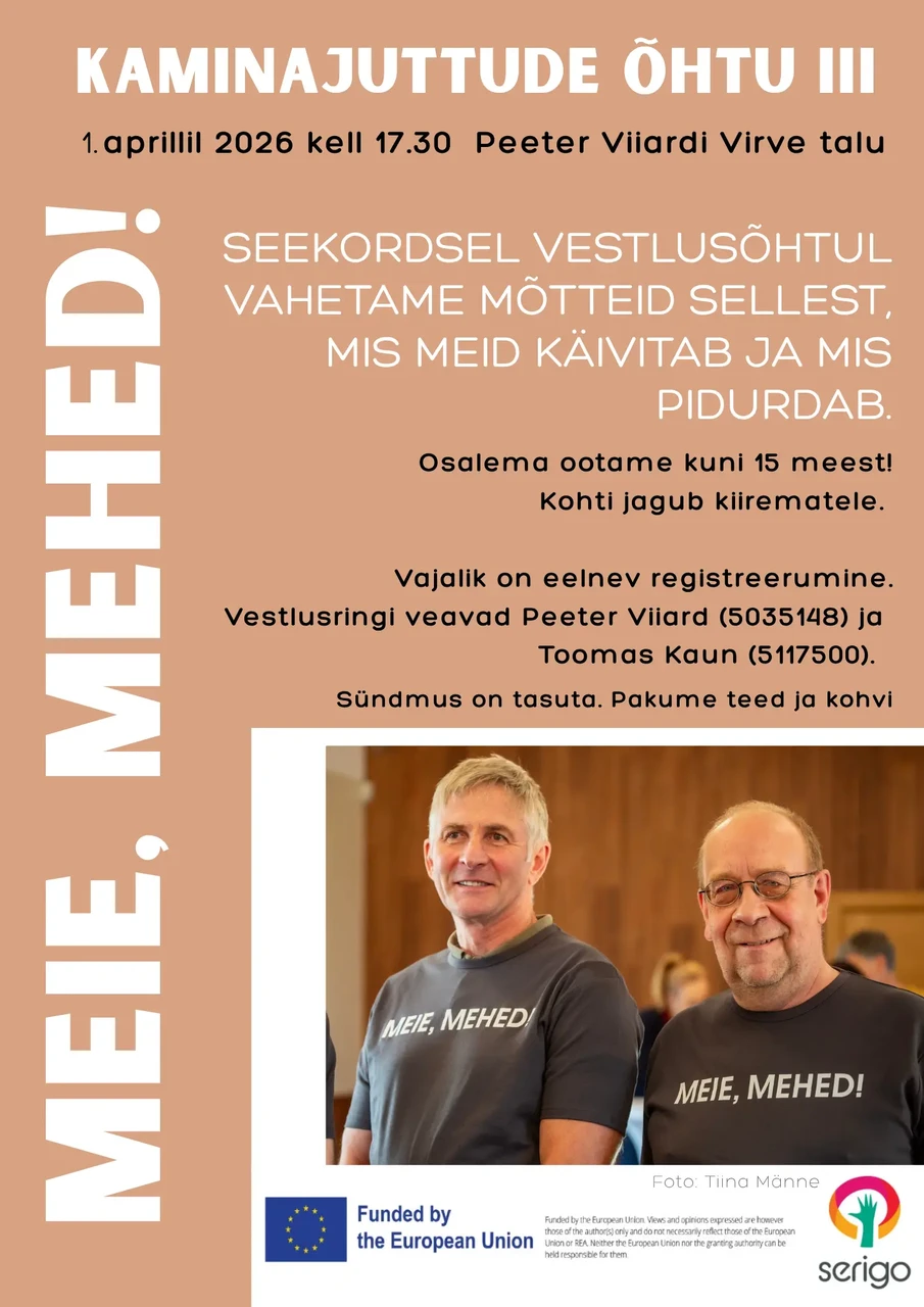Sündmus on tasuta, vajalik on eelnev registreerimine. Kaminaõhtu grupp on piiratud kuni 15 osalejaga, et mehed saaks end mugavalt tunda ja tõstatunud teemadel kaasa rääkida.